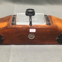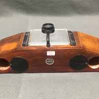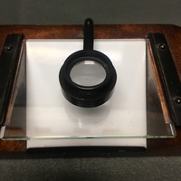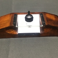 The dissecting microscope is made of solid mahogany with tapered ends that form rests for the hands. The glass stage plate is beveled with a white glass plate located underneath that is placed at an 45 degree angle for illumination. The lens is held in a fitting which swings over the stage plate and slides up and down for focussing. This microscope style was used mainly to study small flowers and plants as well as small animals.