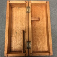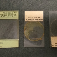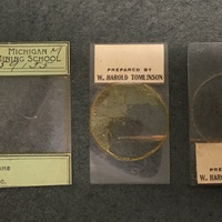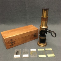 The microscope comes with the following accessories: 2 objectives; 2 slides of minerals from the Michigan Mining School (dated c.1885-1897) 3 slides prepared by W. Harold Tomlinson.