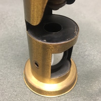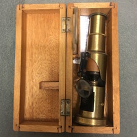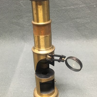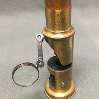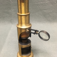 The drum compound is made of lacquered brass. This style was manufactured in France, Germany and England and sold throughout the United States and Europe. Many of the microscopes manufactured using this design were unsigned due to the huge quantities sold by various makers. The microscope consists of a body tube suspended by a tubular base above a circular specimen platform. Coarse focusing is achieved via a sliding mechanism in which the body tube is moved closer or further away from the specimen platform. A bullseye condenser is attached to the front of the microscope which can be adjusted via the double-jointed arm. There is also a concave substage mirror located in the bottom of the microscope, which can be seen through a square cut out. The mirror can be adjusted by thumbscrews on either side of the microscope, however, the mirror is detached on one side. The "coffin-style" wooden case has compartment for the microscope and slides. The case is secured with two swing hooks.