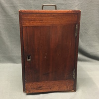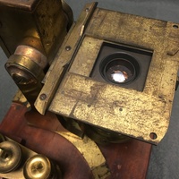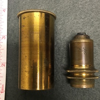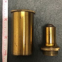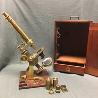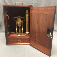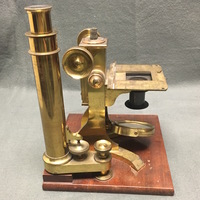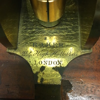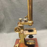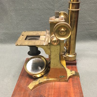 The Charles Baker compound microscope comes with the original mahogany case. The brass microscope can be dissembled to fit into the case. The body tube and arm are secured via a thumbscrew to the mahogany platform which is fixed to the claw-footed base of the microscope. The lacquered brass foot has "BAKER, 244 High Holborn, LONDON" carved into it. The body tube and arm can then be attached via a screw to the pillar of the microscope. The fixed square stage is attached to the pillar and has a square fixture that can be horizontal to adjust the specimen. There is a substage revolving diaphragms that can be removed via a sliding mechanism. Coarse focusing functions via a rack and pinion mechanism and fine focusing is operated via thumbscrew found on the arm. The substage, one-sided mirror is permanently attached to the pillar of the microscope via a gimbal. The mahogany case is farcened with a brass lock which is no longer present on the case with the escutcheon missing. The wooden fitting that would originally have held the two objectives in the case is half missing and so the accessories are now being held in the draw located at the bottom of the case. The draw has a brass pull loop to open and close it. The case also has a brass handle at the top that is used to carry the case.