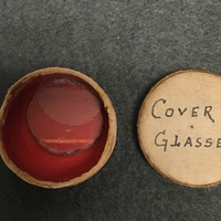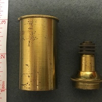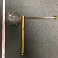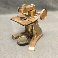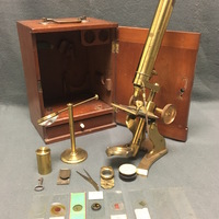 The brass microscope stands on a claw-foot base. The dual curved limb terminates in an inclination joint which allows the instrument to be angled for observation. The square fixed stage has a shelf attachment which allows the slide to be secured for observation. This attachment can be moved horizontally and there is an additional specimen holder attachment which is attached by a pin. Beneath the stage is a iris diaphragm disk with 3 apertures which can be rotated. The sub-stage mirror is attached to the bottom of an cylinder arm and sits in a gimbal. The body-tube is screwed into an arm attachment, and the objective lens can be screwed into the body-tube. The compound microscope also comes with a bulls-eye condenser with its own stand. The fitted, mahogany case has a brass carry handle and would be secured by a lock, however, it is no longer attached to the case.