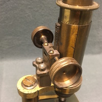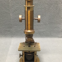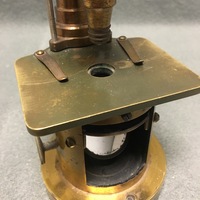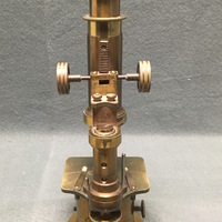 The drum-style compound microscope is crafted from brass and stands on a lead-weighted circular base. The designer of the instrument, Georg Johann Oberhaeuser (1798-1868) established a microscope-making business in Paris in the 1830s. The instrument is signed "G. Oberhaeuser, Place Dauphine, Paris" on the body tube. Due to the drum-style design, the substage mirror sits in a cylinder compartment with a square cut-out, by which the light can reach the mirror. On either side of the compartment are small thumbscrews that allow the position of the mirror to be adjusted. Above the mirror is a wheel of apertures mounted to the stage that can be rotated to control the amount of light that reaches the specimen. The square stage has two stage clips to hold slides in place. The column pillar connects the stage to the body tube. Another aspect of this design is that the microscope cannot be angled and so must stand completely straight when being used. Coarse focusing is, unusually, by a rack and pinion mechanism. The style usually included a sliding mechanism for focusing, and so this instrument may have been a custom order. The two threaded holes in the base suggest that the microscope was mounted to a desk for industrial or scientific use.