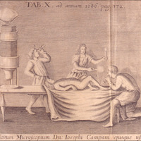 Digital image of an illustration of a Campani microscope being used as a diagnostic tool in medicine. (1686) Giuseppe Campani, a scientist and lens maker (1634-1715) crafted his microscope and in the illustration it is being used to examine a man on a table while a woman holds a candle and mirror for illumination. This image highlights the early potential of the instrument in scientific investigation.